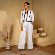 Chic white linen jacket with navy details, offering a polished and modern appearance.