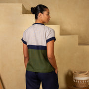 A stylish and versatile top featuring olive green, navy blue, and stone grey color blocks, crafted from breathable linen for a comfortable and chic look.