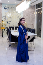This Kaftan is designed with embroided lace on sleeves with a beautiful V neck. Crafted in Velvet, with beautiful side slits also embalished with embroided lace. Product Type: Velvet Care Instruction: Dry clean only.