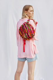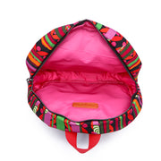 Stylish backpack Fun Bamboos with the signature textile pattern FB. The textile pattern was inspired by an incredible oriental colorful bazaar. The combination of different shades of orange, red, purple, and green makes the pattern amazing vibrant. Crafted from 100% cotton can be worn for going to the beach, school, shopping, Pilates, yoga, or whatever you do!