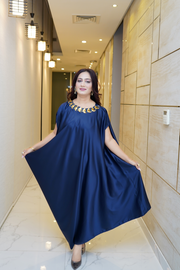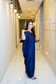 This gorgeous silk maxi dress with one shoulder has a round neckline embellished with sequins and stones. Its a free-sized fit, making it an absolute must-have for any occasion. Product Type: Silk Care Instruction: Dry clean only.