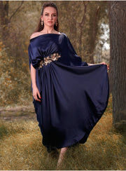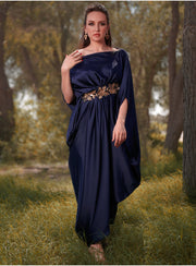 Navy blue shade Greek style pleated gown with inner tie and convertible on and off shoulder neck. Product ID : 37081