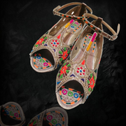 This Eid adorn yourself with a true masterpiece of craftsmanship, taking inspiration from the exquisite designs and embellishments favored by the Mughal Empress Nur Jahan. This flat sandal features a peep-toe with ankle strap, colorful thread work and sparkling embellishments that perfectly embody the essence of Pakistani tradition and culture. The base and vibrant colors create a regal and sophisticated look that exudes elegance and grace. Wearing these sandals will make you feel like royalty, channeling the same poise and style as the iconic Empress Nur Jahan.