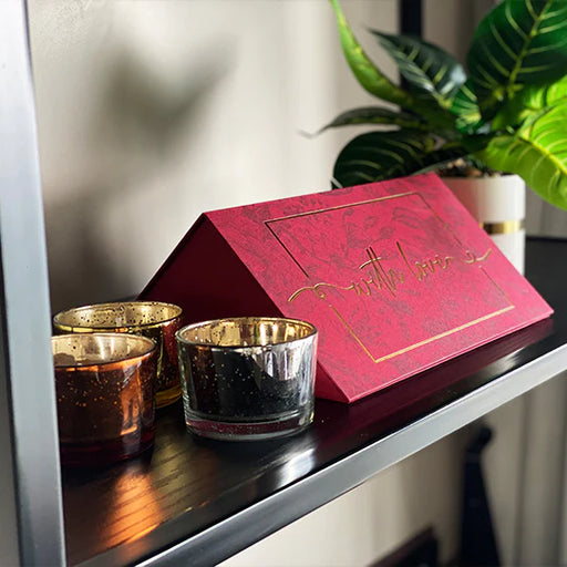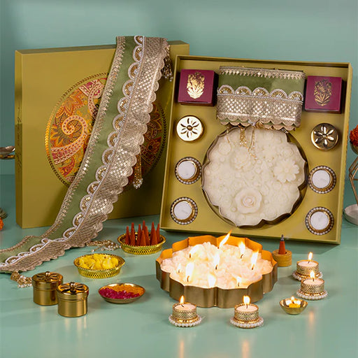 Radha is a tribute to sanctity and discipline, featuring fragrant dhoop sticks, incense sticks, and delicate mishri jars. Accented with a wooden ur...