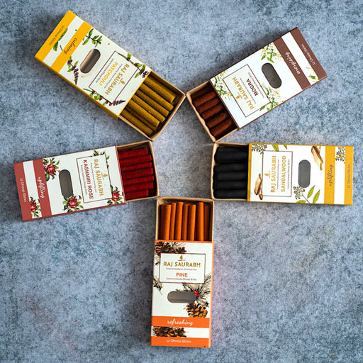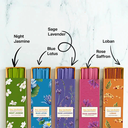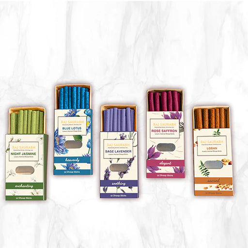 Get the complete experience of Loban, Sage Lavender, Blue Lotus, Rose Saffron and Night Jasmine by purchasing a set of 5 Fragrance Dhoop Sticks in ...