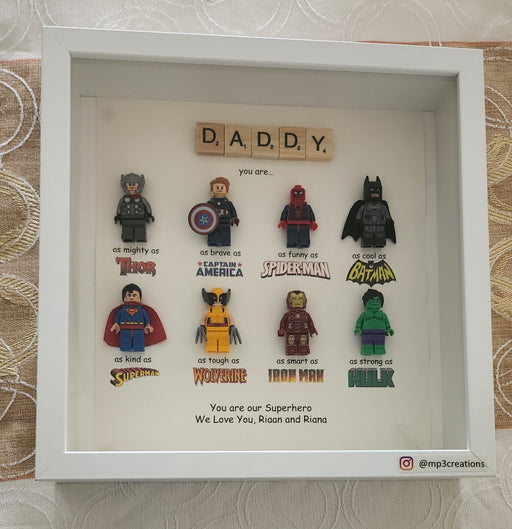 MP3CreationsA unique gift for all the wonderful Fathers out there. 8 lego superheros included as shown in picture. Personalise it by adding the kids' names. Fr...