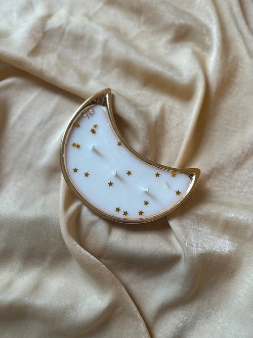 SoyJoy CandlesHandpoured candle in a ceramic crescent shaped trinket tray, using natural soy wax and non toxic amber oud fragrance. 5 inches candle tray in Gold