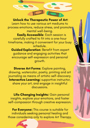 Whether you're looking to enhance your mental well-being or benefiting from Art Therapy, "Healing Through Art" offers a unique and enriching experience. Join us in discovering the therapeutic potential of art and embark on a journey of self-discovery, healing, and creative expression. Start your transformative adventure today!