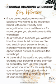 3-hours live personal branding workshop for women in business that you will learn and work on how to create, build, communicate and sustain your personal brand to increase visibility, recognition and impact in your business.