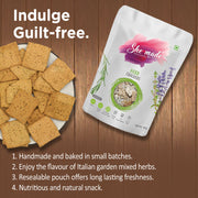 All it takes to lighten up your day is this inviting combination of fresh and delicious herbs like oregano and parsley. Made using almond meal flour, our baked crackers have a wholesome crunch. The herbs pack oodles of flavour and italian garden fresh vibes in every bite. The ingredients have been carefully curated to make the crackers a healthy and low-calorie treat.
