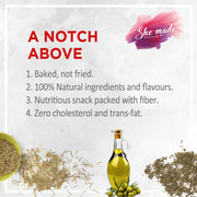 Our crunchy cracker biscuits are packed with the nutrition of pure ingredients. Almond meal flour in the crackers makes them fibre dense and gives them a light, flaky texture. Oregano and parsely are known to be packed with anitoxidants, vitamins and minerals. No cholesterol and zero trans-fat makes them a healthier choice over oily and fried snacks to fulfil your savoury kick. The baked crackers are also plant-based, vegan and free from any allergens such as gluten, peanut, soy, and wheat.
