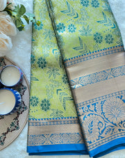 Six yards saree weaved to elegance and grace. This is a premium semi bridal saree from our collection. Light green and blue combination is something which is rare.