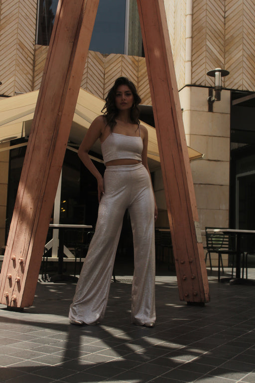 The Fashion HouseWide-leg pants with stretchy waist , Spaghetti-Strap Crop Top Product type : Metallic Lycra Two piece Set Color : Color Silver Rose