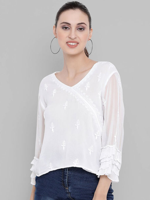 T' Naaz - Naaz TabassumA sweet frilled sleeve blouse with eye-catching delicate embroidery at overlapping neckline made from flowy georgette proves that flowery motifs al...