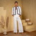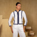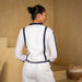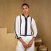 Chic white linen jacket with navy details, offering a polished and modern appearance.