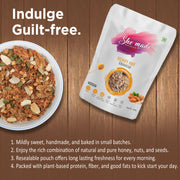 Packed with rolled oats, honey, walnuts, almonds, edible vegetable oil, cinnamon powder, and freeze dried apple, our honey nut granola is an excellent choice for everyone. With a crunchy base, delicious nutty flavour, and undertones of cinnamon, our baked granola is a perfect snack to eat any time.
